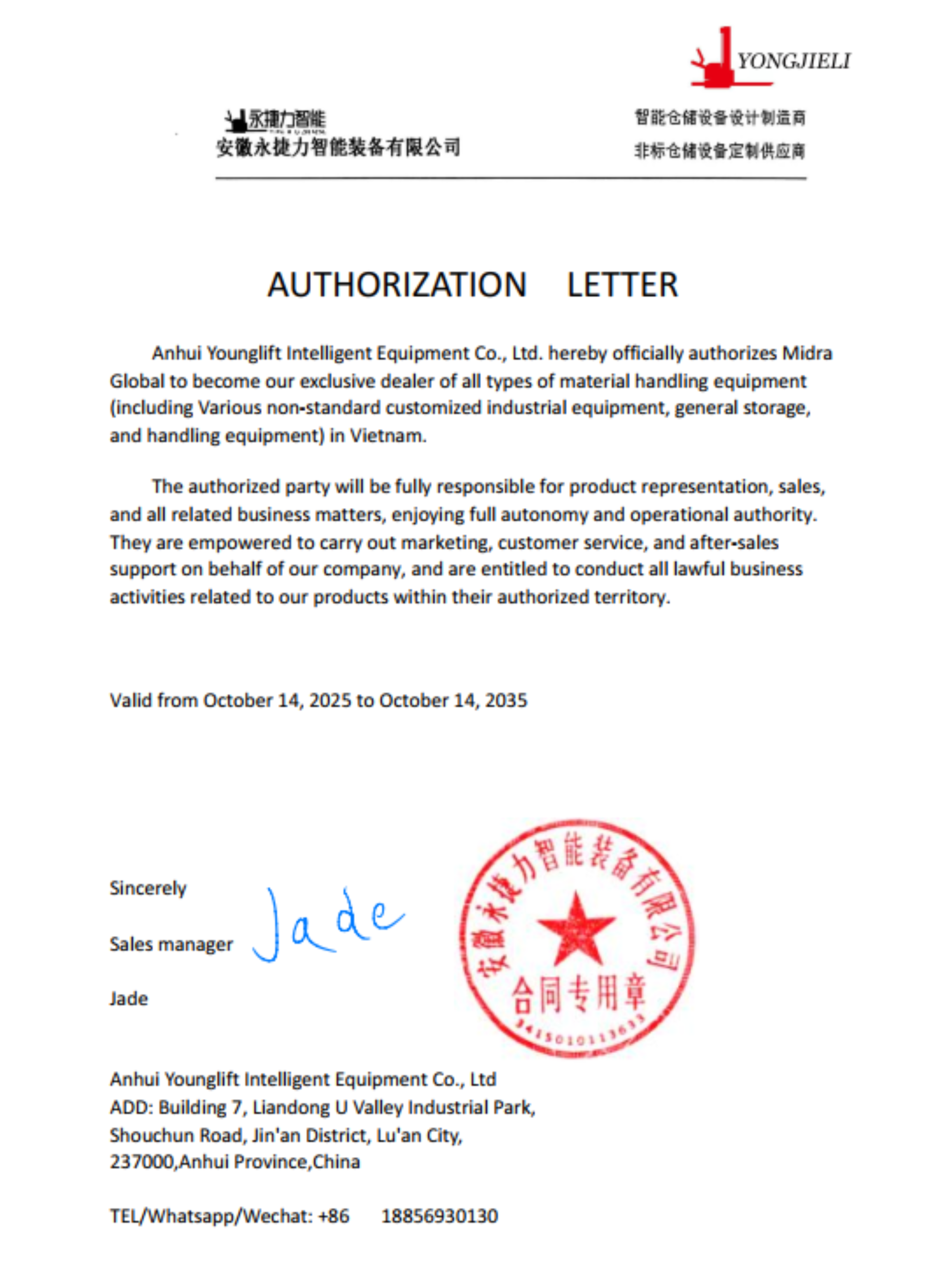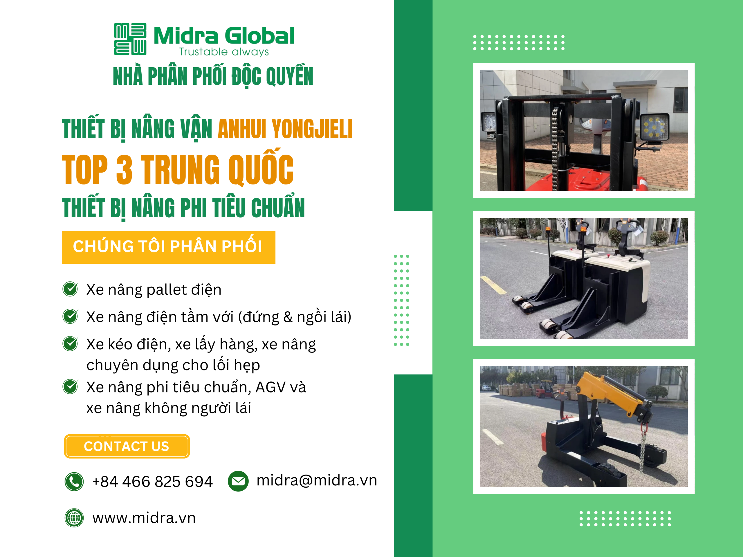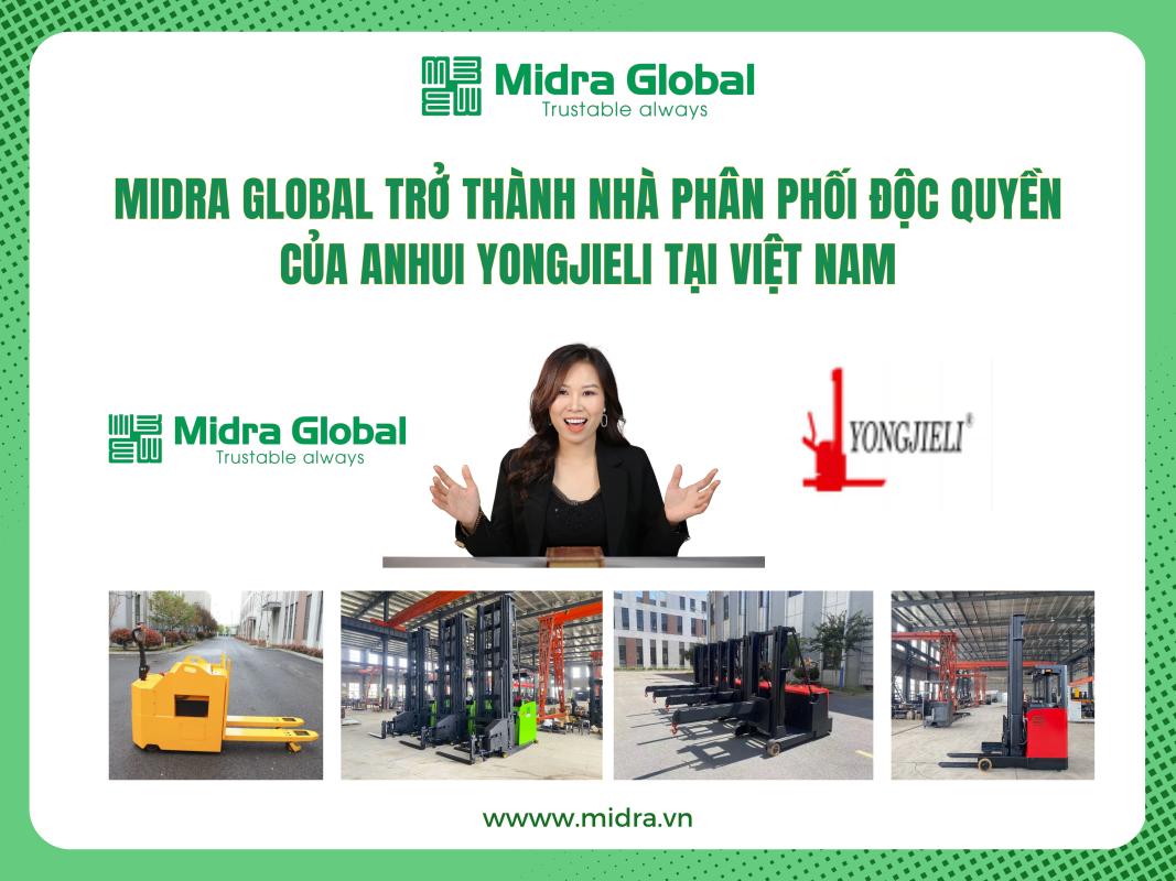 Công ty TNHH Midra Global chính thức được Anhui Yongjieli Intelligent Equipment Co., Ltd. – doanh nghiệp công nghệ cao hàng đầu Trung Quốc trong lĩnh vực thiết bị nâng, vận chuyển vật liệu tiên tiến, ủy quyền làm nhà phân phối độc quyền tại Việt Nam.