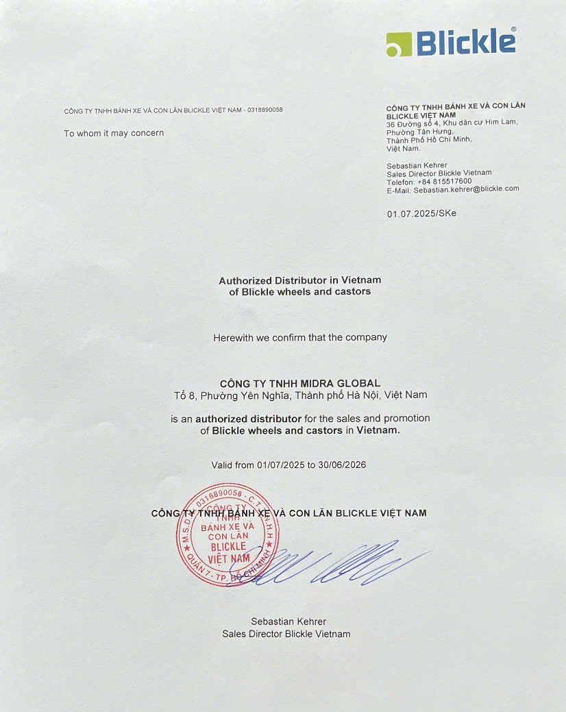 Từ ngày 01/07/2025, CÔNG TY TNHH MIDRA GLOBAL chính thức được chỉ định là Official Authorized Distributor of Blickle Wheels & Castors in Vietnam – Đại lý ủy quyền chính thức cho hoạt động bán hàng và xúc tiến thương hiệu bánh xe & càng bánh xe Blickle tại thị trường Việt Nam, theo chứng nhận do Blickle Vietnam cấp, có hiệu lực đến ngày 30/06/2026.