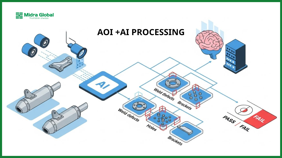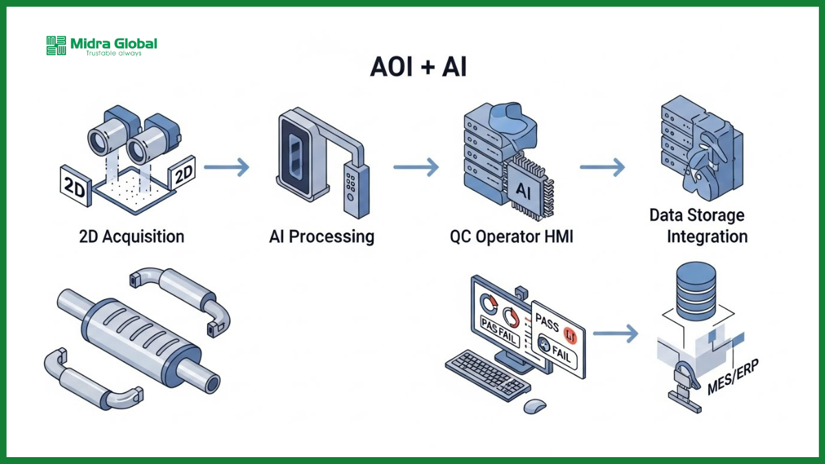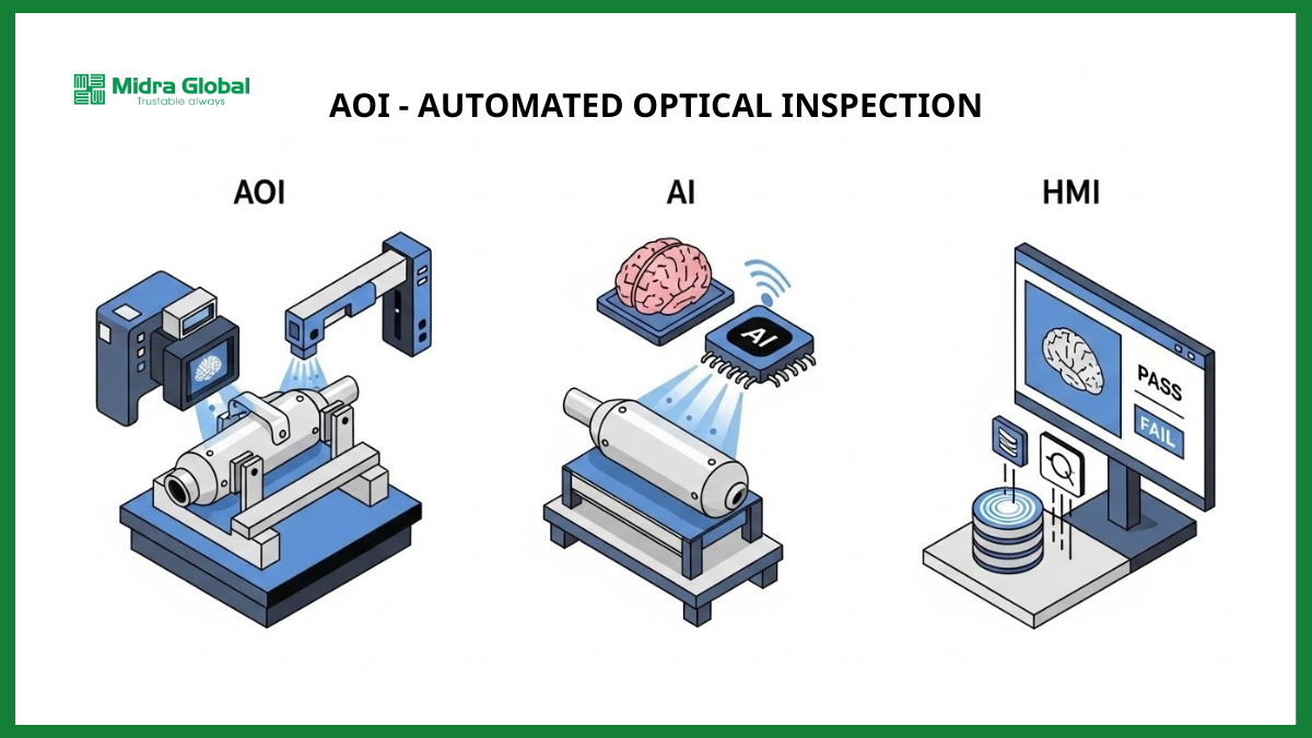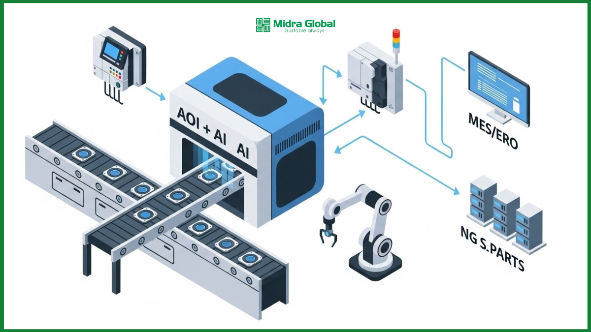 Từ góc nhìn của Midra Global, đây là bước mà nhiều nhà máy hay nghĩ là… đơn giản. Thực tế, một hệ thống AOI + AI không phải chỉ là “gắn thêm vài cái camera và một phần mềm AI”, mà đó là một nền tảng kỹ thuật hoàn chỉnh tích hợp quang học – tự động hóa – trí tuệ nhân tạo – dữ liệu sản xuất.