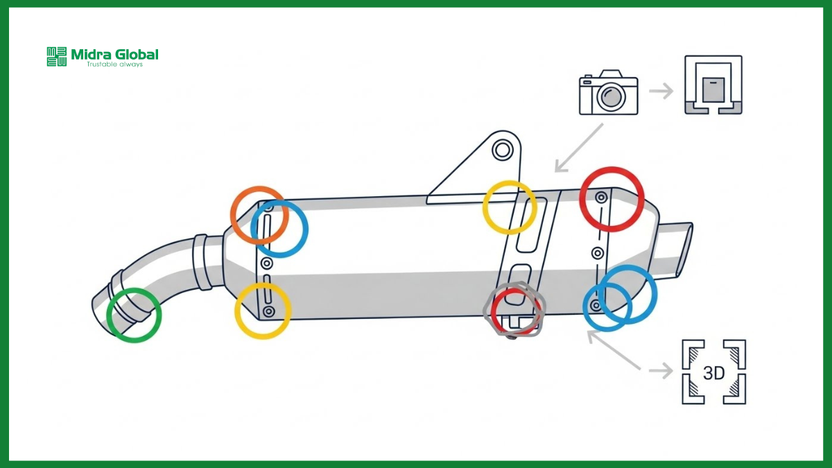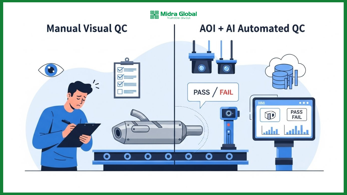 Các chuyên gia của Midra Global đã nghiên cứu sâu về các hệ thống AOI + AI (kiểm tra quang học tự động) có độ phức tạp cao dành cho QC nhà máy sản xuất các bộ phận ô tô và xe máy. Đội ngũ của Midra đã tích hợp kỹ thuật công nghiệp, thị giác máy tính (computer vision) và tự động hóa vào một nền tảng turnkey duy nhất, phù hợp với điều kiện nhà máy Việt Nam.