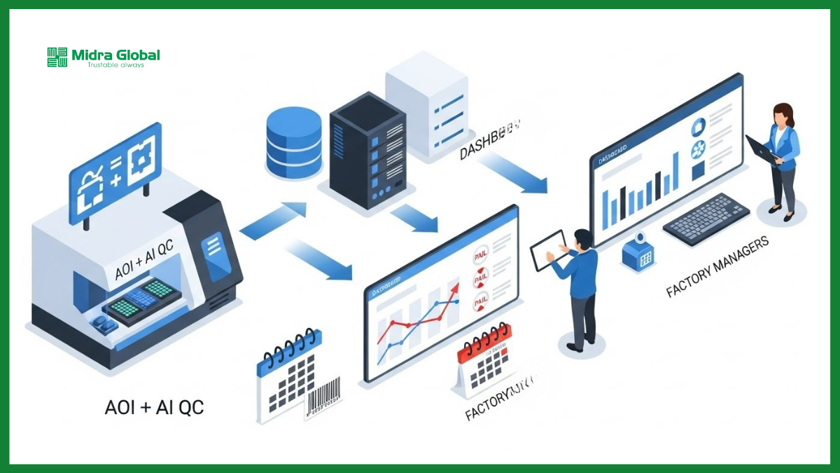 Trong các dự án thực tế, Midra Global thiết kế trạm AOI + AI sao cho:
