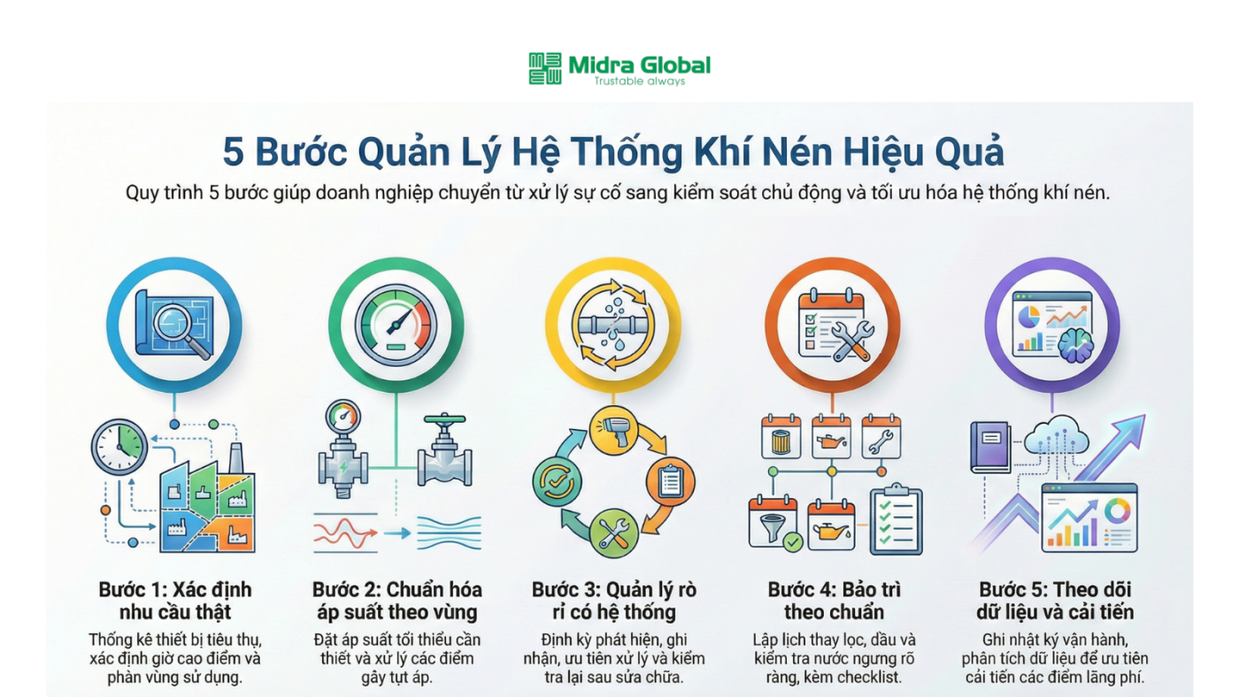 Quy trình 5 bước quản lý hệ thống khí nén hiệu quả