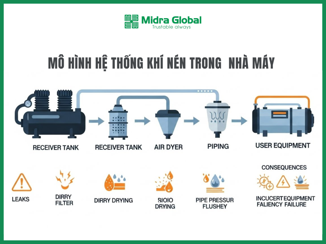 Trong bài viết này, Midra Global tổng hợp 8 sai lầm phổ biến khi quản lý hệ thống khí nén, kèm dấu hiệu nhận biết và cách khắc phục để doanh nghiệp giảm lãng phí, tăng độ tin cậy vận hành và kéo dài tuổi thọ thiết bị.