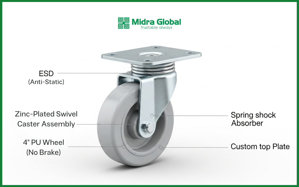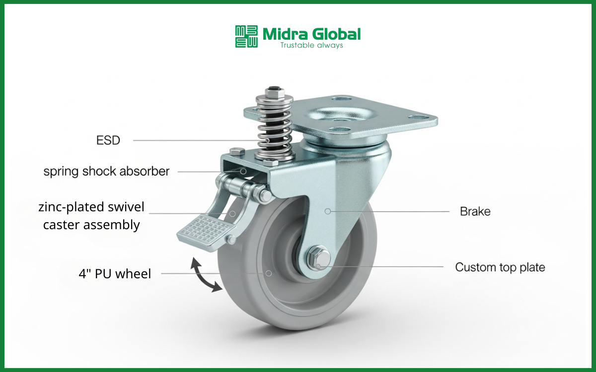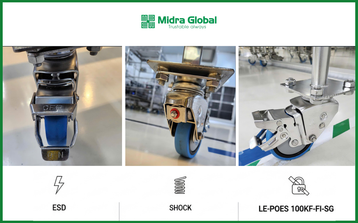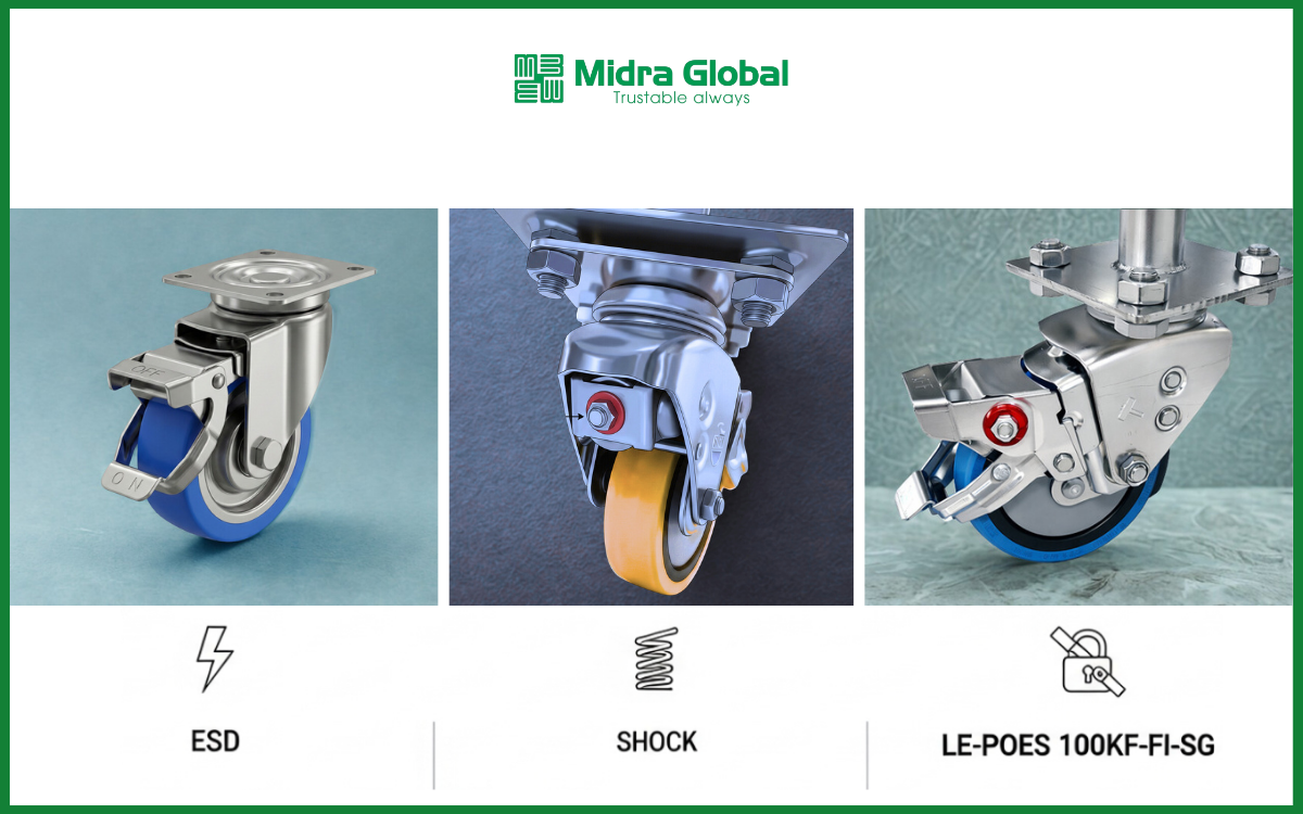 Midra Global phát triển dòng bánh xe có thể tích hợp chống tĩnh điện (ESD) và lò xo giảm xóc theo yêu cầu sử dụng thực tế. Điều này đặc biệt phù hợp với các tình huống như:
