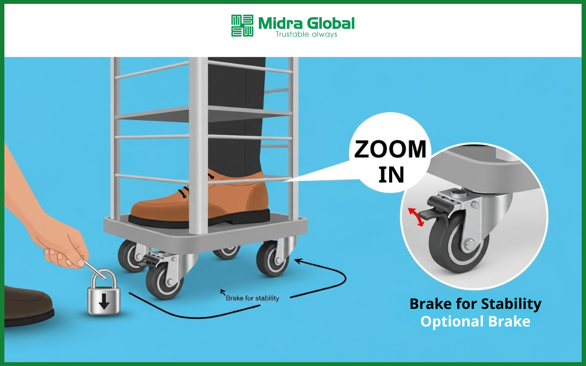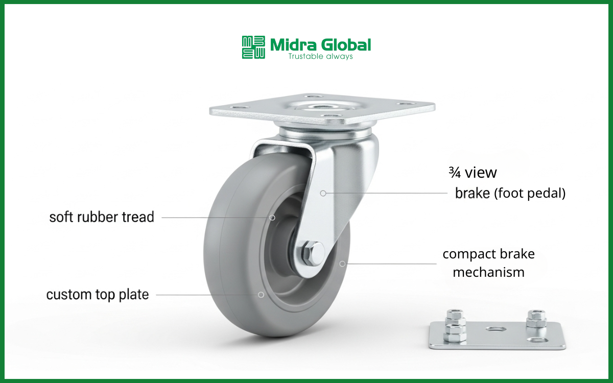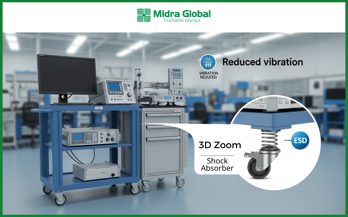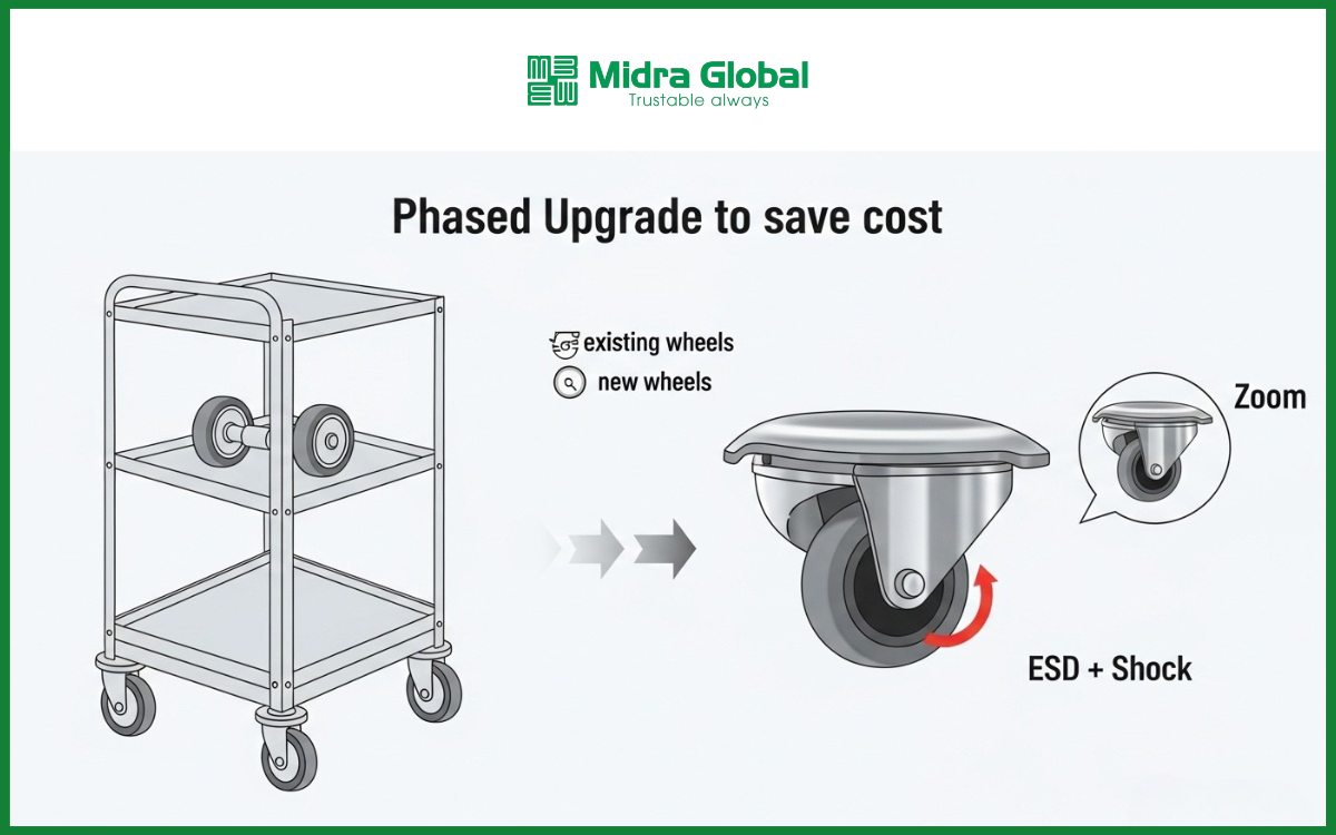 Midra Global phát triển dòng bánh xe có thể tích hợp chống tĩnh điện (ESD) và lò xo giảm xóc theo yêu cầu sử dụng thực tế. Điều này đặc biệt phù hợp với các tình huống như: