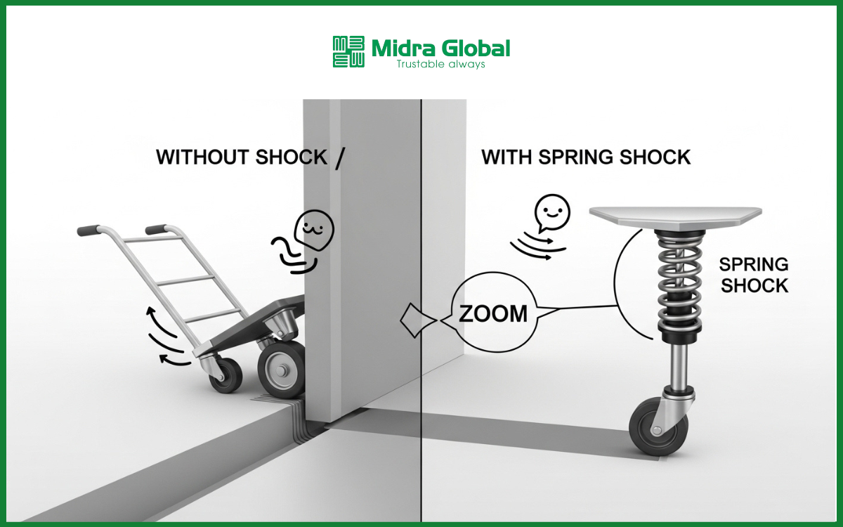 Đó là lý do Midra Global phát triển dòng bánh xe thiết kế riêng theo yêu cầu nhà máy, trong đó nổi bật là cấu hình ESD + lò xo giảm xóc, một tổ hợp gần như rất hiếm gặp trên thị trường.